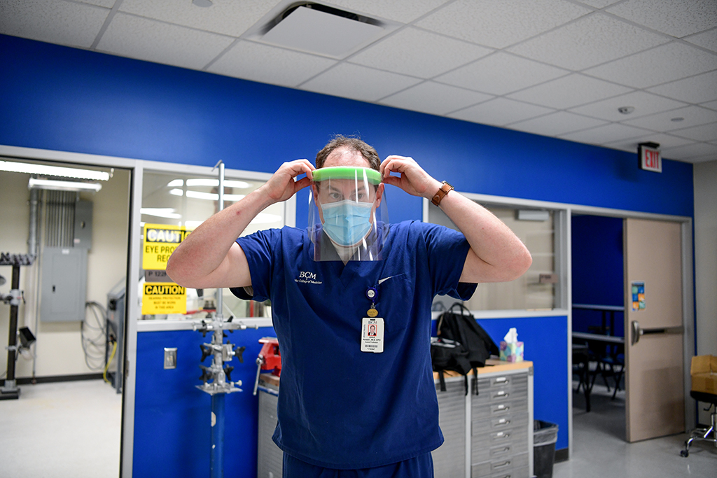 Face Shields_8 Published April 13, 2020 at 1024 × 683 in Baylor answers the need for PPE ← Previous Next → Jared Howell demonstrates a face shield made at Baylor.