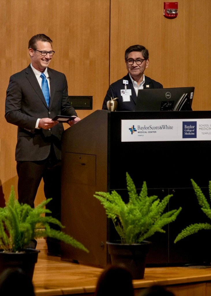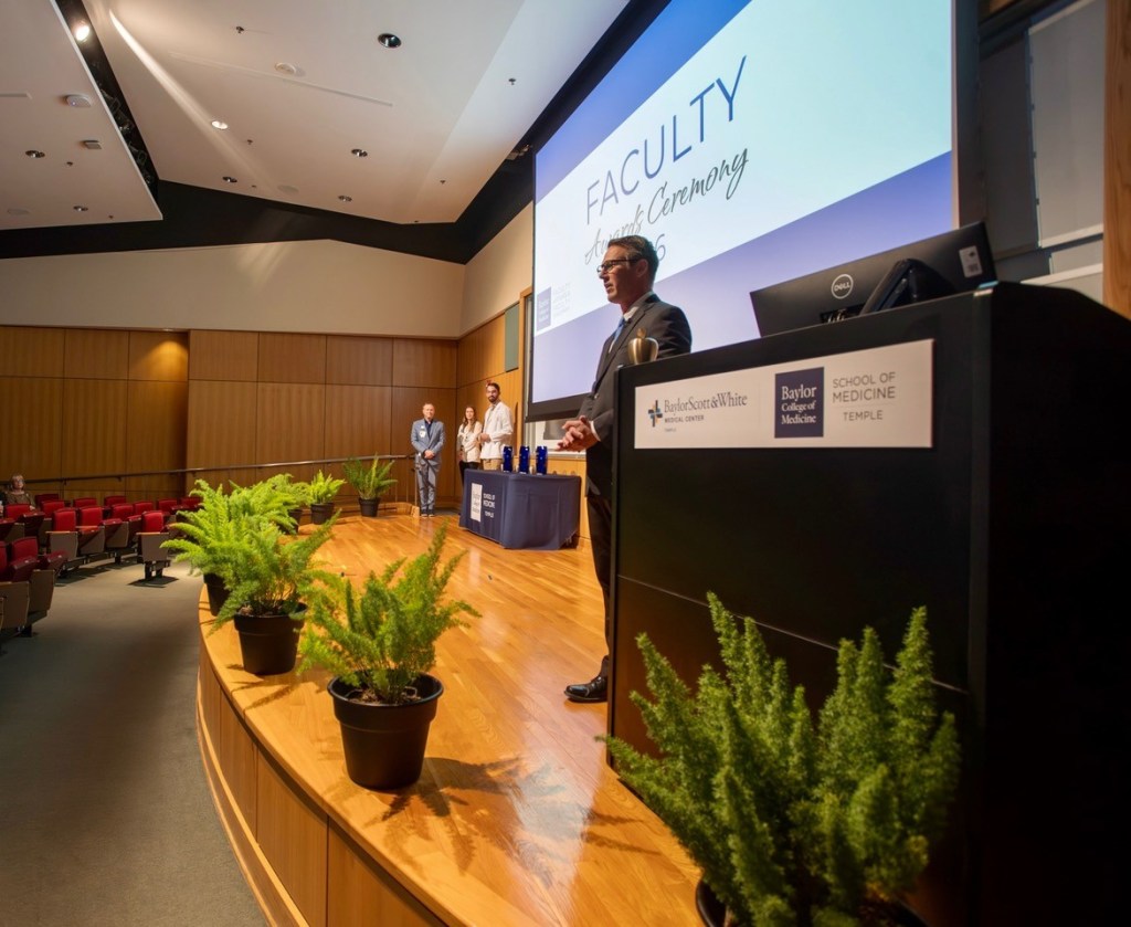 Serving as masters of ceremonies, Dr. Jesus Vallejo, regional dean of the Temple Campus, and Dr. W.C. Culp, Jr., associate dean of faculty affairs and faculty development, reflected on the city of Temple’s 100-year legacy of excellence in medical education and underscored the vital role of faculty in advancing the institution’s educational mission. Undergraduate Medical Education awards were presented by Dr. Steve Charles, associate dean of curriculum, and Graduate Medical Education awards were presented by Dr. Belinda Kohl-Thomas, senior faculty at BCM-Temple and designated institutional official of GME at Baylor Scott & White Medical Center.