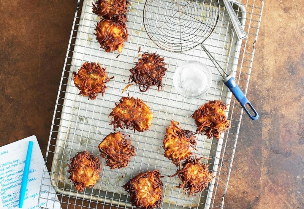 - In a cast iron fry pan (cast iron pans work best, but I’ve made these in all kinds of pans), coat the bottom with canola or peanut oil and heat up the oil. As you fry these latkes, you’ll need to add some more oil to make sure that there is a thin layer (maybe 1/4 inch) of oil at all times. With your hand grab a scoop of the mix about the size of a golf ball. Put the latke in the hot oil, and when the oil is hot enough, you will immediately hear a sizzling sound. Lightly press down on the mound of potato and onion to spread it out. Watch out for hot oil splatters!! Fry until both sides are golden brown — about a minute and half per side. Do this in several batches; it is important to keep the latkes warm while you are making the whole batch. You can do this by putting them on a wire rack on top of a cookie sheet and place that in a warm oven.